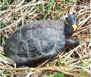 In addition to frogs, toads, newts, snakes, and the many birds and terrestrial wildlife around those waters, her farm springs provide a refuge for federally threatened Bog Turtles (Glyptemys muhlenbergii). These small, shy emydid turtles, with their crisply etched shells and brialliant yellow-orange ear patches, spend their summers crawling along streams and wetands. They breed in her bog and other wetlands in the area. But come autumn, they make their way up to the springs, and brumate (turtle for “hibernate”) in the mud at the edge of the spring. A coldwater spring, it maintains a constant water temperature through the winter that is slightly warmer than freezing. Although some turtles (how to say this in a way that doesn’t get the kids thinking too deeply?) can respire through their cloacae, brumating Bog Turtles absorb oxygen through their skin as they sleep. So, the springs on my sister’s farm provide essential over-wintering habitat for this species. Bog Turtle endangerment is, of course, related to habitat disruption and loss, but federal protection allows some progress in bolstering their populations, as long as the government continues to honor the Endangered Species Act.